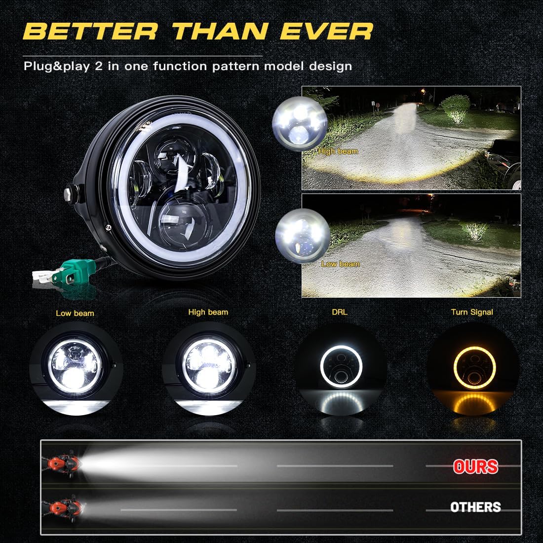 | Additional Features | Complete Headlight Kit [assembled with housing bucket], High Low Dual Beam, Integrated with halo ring,white/amber drl/angle eyes, Waterproof, With Clamp Mounting Brackets Fit for 1.37"-1.69"/34~42mm Fork Tubes【For The Forks Not Perfect Fit:Squeeze/Bend With C-clamps/Channel Locks to Get The Brackets Close The Size of Forks,Then Fastening With Screws】 |